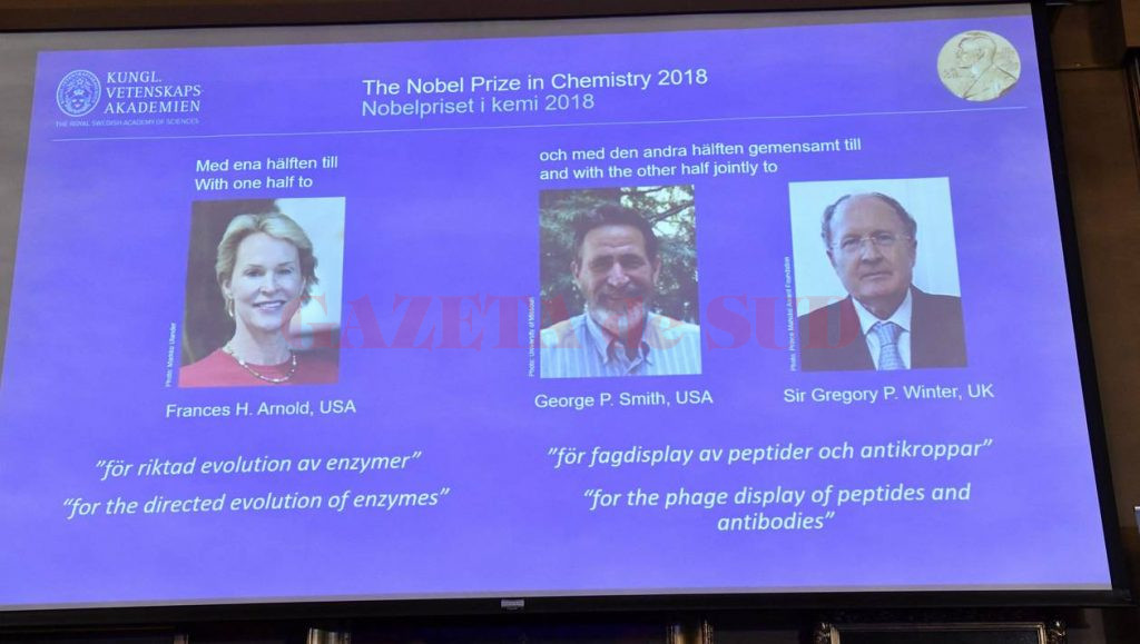 Cercetătoarea americană Frances H. Arnold şi o echipă formată din oamenii de ştiinţă George P. Smith (SUA) şi Gregory P. Winter (Marea Britanie) au fost desemnaţi câştigătorii Premiului Nobel pentru Chimie în sezonul din 2018 al acestor prestigioase distincţii, ei fiind recompensaţi ”pentru o revoluţie bazată pe evoluţie”, după cum a anunţat miercuri Academia Regală de Ştiinţe din Suedia, scrie Agerpres.
