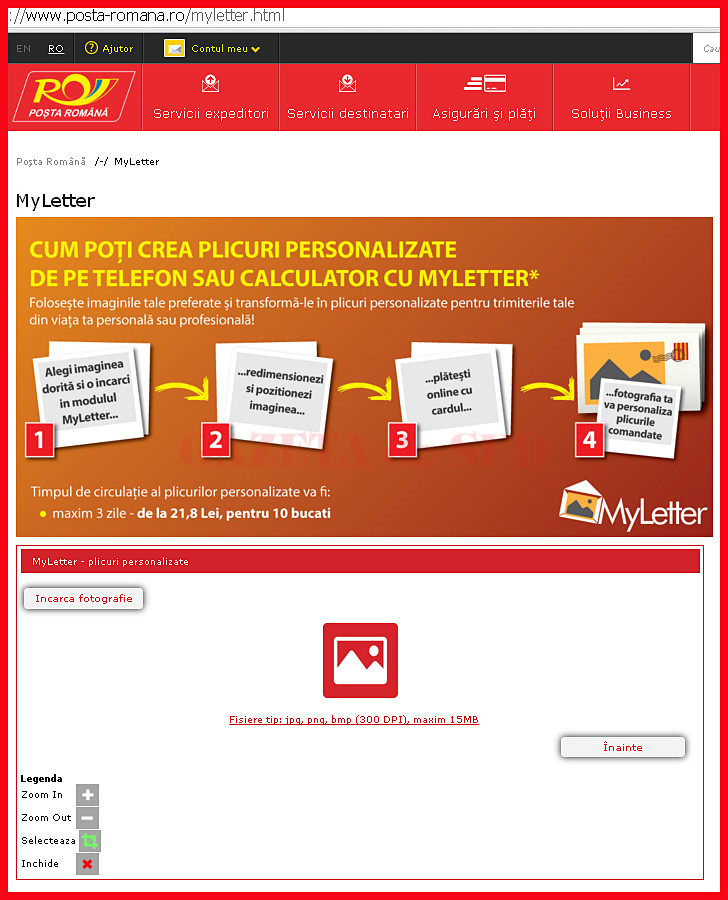 Noul serviciu este disponibil pe site-ul www.posta-romana.ro, secţiunea MyLetter, unde expeditorul va încărca fotografia preferată, va vizualiza poziţionarea pe faţa plicului, şi va completa datele sale şi ale destinatarului. Clientul va plăti serviciul tot online, prin intermediul cardului bancar şi va primi factura pe adresa de e-mail comunicată. Plata se efectuează în condiţii de maximă siguranţă, prin intermediul platformei de plăţi online pe care Poşta Română o pune la dispoziţia clienţilor.