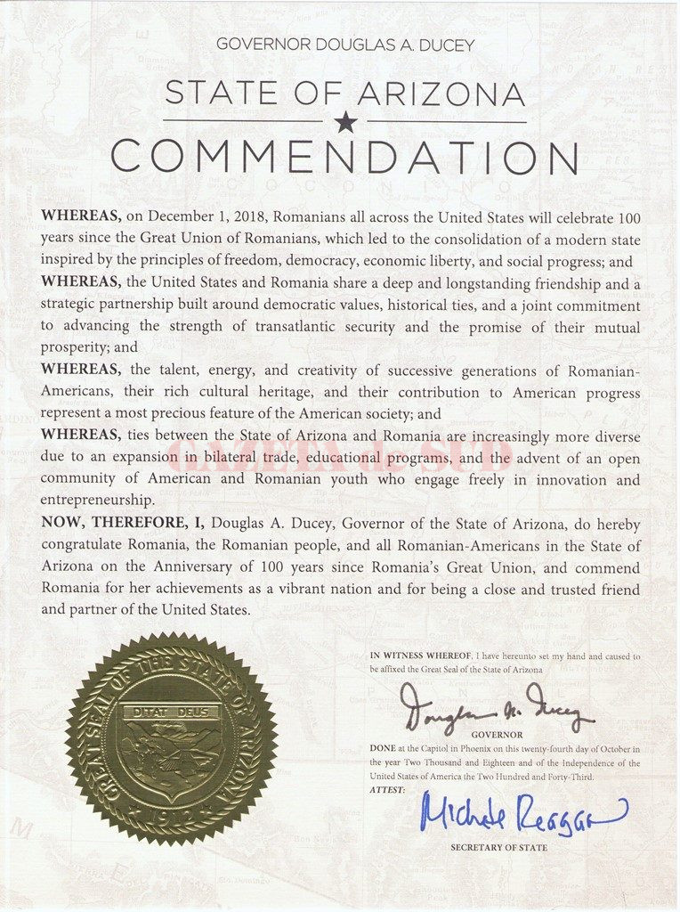 Guvernatorul statului Arizona, Douglas Ducey, a emis o proclamație de felicitare a României cu ocazia Centenarului Marii Uniri, în care sunt menționate legăturile strânse dintre România și Statele Unite ale Americi care au alimentat și prietenia dintre Statul Arizona și țara noastră. “Statele Unite și România împărtășesc o prietenie de lungă durată și un parteneriat strategic construit în jurul valorilor democratice, a legăturilor istorice și a angajamentului comun de a întări securitatea transatlantică”, se arată în textul proclamației.