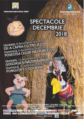 Duminică, 9 decembrie, la ora 11:00, se va juca „Povestea celor trei purceluși”, din spectacolul interactiv de și cu Geo Dinescu și Marin Fagu, pictura Iulia Goanță. Cei doi actori devin parteneri de scenă cu micii spectatori și descoperă împreună frumusețea jocului.