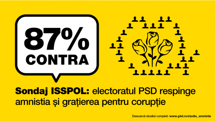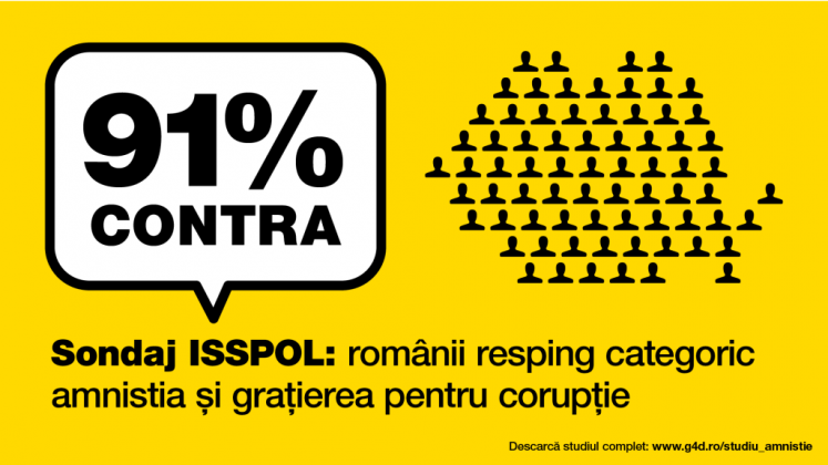 91% dintre români se opun amnistiei și grațierii în cazul faptelor de corupție, arată un sondaj ISSPOL realizat la solicitarea Geeks for Democracy, în perioada 4-11 decembrie, și dat publicității miercuri, 12 decembrie.