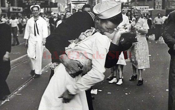 În imagine apar doi tineri care se sărută în Times Square, New York, pe 14 august 1945, la sfârşitul celui de-al Doilea Război Mondial. La momentul respectiv, Mendonsa era marinar, iar fotografia a simbolizat bucuria unei naţiuni la finalul unuia dintre cele mai sângeroase conflicte armate din istorie.
