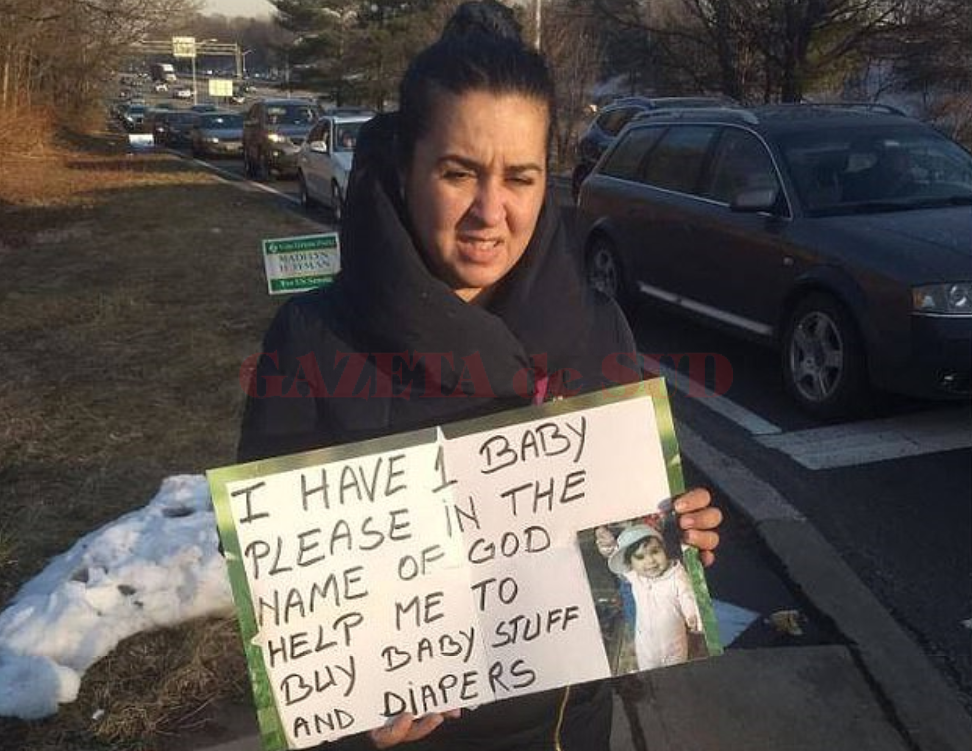 Poliția din New Jersey a reținut o româncă în vârstă de 34 de ani, acuzată că cerșea pe marginea unei șosele aglomerate, sub un pretext fals. Dorina Căldăraș stătea pe marginea străzii cu o pancartă pe care era lipită poza unui copil și mesajul: „Am un bebeluș. Vă rog, în numele lui Dumnezeu, ajutați-mă să cumpăr scutece și lucruri pentru copil”.