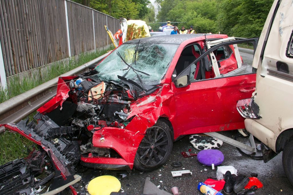 Trei români, şoferul de 56 de ani şi alţi doi bărbaţi, 20 şi 56 de ani, călătoreau într-un VW Caravelle şi, din cauze neelucidate încă, maşina lor a intrat pe contrasens, lovindu-se frontal de Skoda condusă de un bărbat în vârstă de 58 de ani. De asemenea, pasagerii români din microbuz au fost luaţi cu elicopterul de la locul accidentului, fiind grav răniţ.