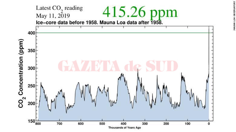 Potrivit datelor de la Observatorul Mauna Loa din Hawaii, concentrația de CO2 din atmosferă este de peste 415 ppm, mult peste orice nivel din ultimii 800.000 de ani, de când a început evoluția homo sapiens.