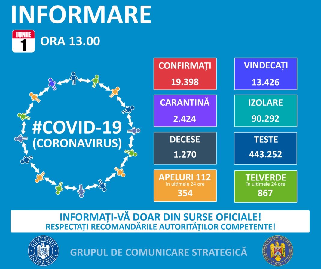 Alte 141 de noi cazuri de infectare cu coronavirus au fost raportate luni, în România, bilanțul ajungând la 19.398 . Numărul pacienților vindecați, de la începutul epidemiei este de 13.426, potrivit datelor furnizate de Grupul de comunicare Strategică.
