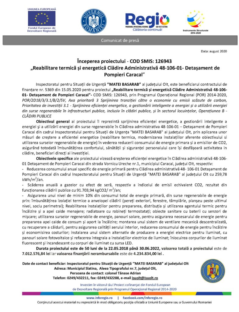 Inspectoratul pentru Situații de Urgență ’’MATEI BASARAB” al județului Olt, este beneficiarul contractului de finanțare nr. 5369 din 15.05.2020 pentru proiectul „Reabilitare termică și energetică Clădire Administrativă 48-106-01- Detașament de Pompieri Caracal”- COD SMIS: 126943, prin Programul Operațional Regional (POR) 2014-2020, POR/2D18/3/3.1/B/2/SV, Axa prioritară 3 Sprijinirea tranziției către o economie cu emisii scăzute de carbon, Prioritatea de investiții 3.1 – Sprijinirea eficienței energetice, a gestionării inteligente a energiei și a utilizării energiei din surse regenerabile în infrastructuri publice, inclusiv în clădiri publice, și în sectorul locuințelor, Operațiunea B – CLĂDIRI PUBLICE