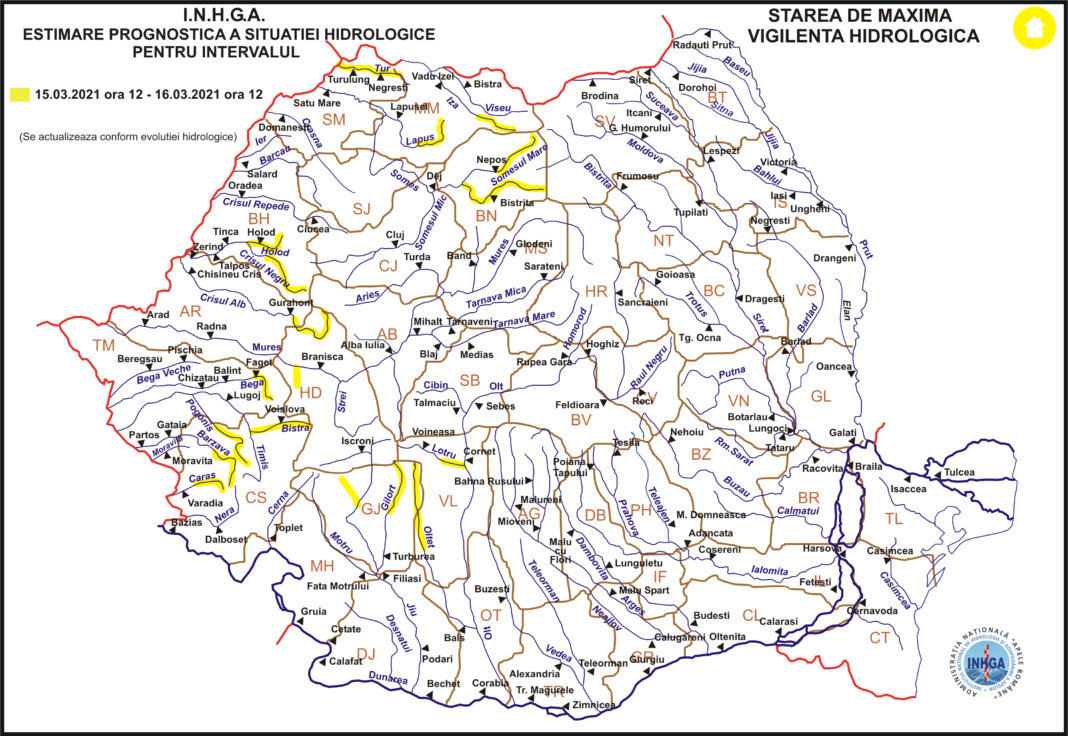 Institutul Național de Hidrologie și Gospodărire a Apelor a emis o atenționare de Cod galben de inundații, valabil în intervalul 15 martie, ora 12.00 – 16 martie, ora 12.00. Vor fi afectate râurile din bazinele hidrografice: