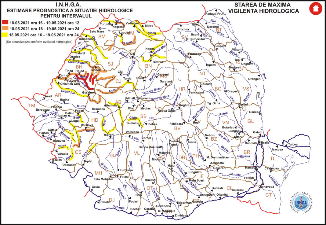 Astfel, în intervalul 18 mai, ora 16:00 – 19 mai, ora 24:00, este în vigoare un Cod portocaliu de creşteri rapide de debite şi niveluri, cu posibile depăşiri ale Cotelor de Inundaţie, pe râurile din bazinele hidrografice: