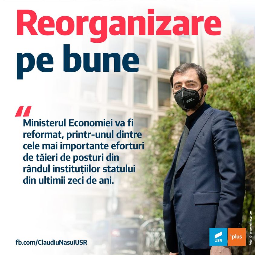 “Ministerul Economiei va fi reformat, într-unul dintre cele mai importante eforturi de tăieri de posturi din rândul instituţiilor statului din ultimii zeci de ani. Reducem 39% din funcţiile de conducere şi 30% din cele de execuţie, printr-un plan pe care l-am pus la punct săptămânile acestea. Actualul Minister al Economiei este rezultatul multiplelor despărţiri şi comasări de ministere. Ministere inutile create numai pentru a oferi sinecuri în negocieri politice. De aceea, Ministerul Economiei a ajuns să aibă foarte multe structuri şi, mai ales, foarte mulţi şefi”, a scris, pe Facebook, Claudiu Năsui.