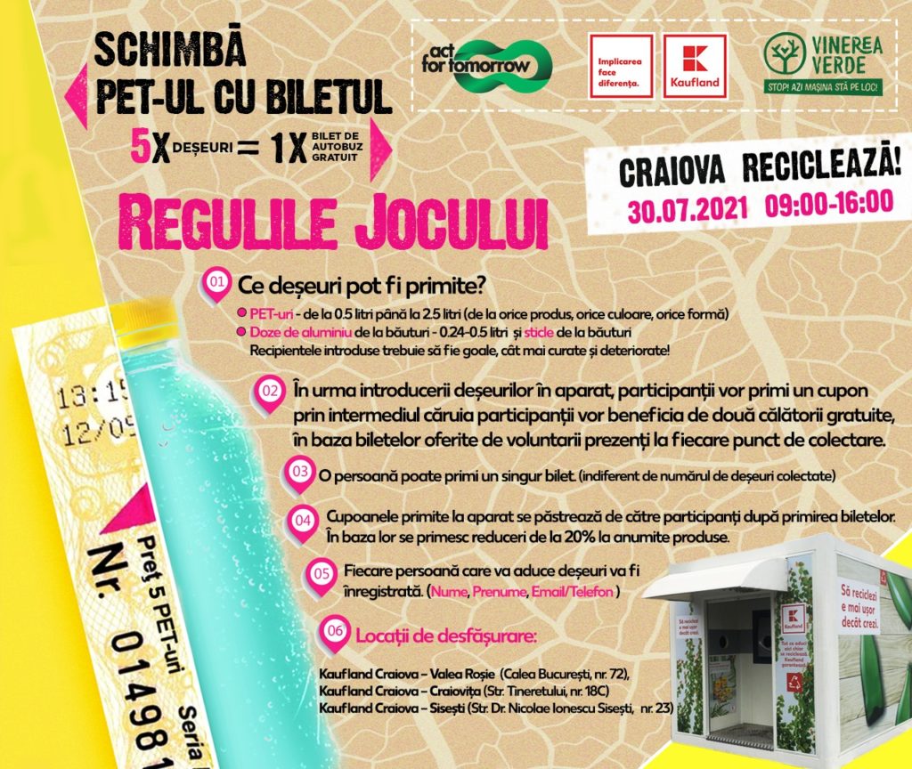 Potrivit unui comunicat Act for Tomorrow și Kaufland România, cei dornici să participe vor oferi 5 deşeuri (PET, sticlă sau doze de aluminiu) la schimb pentru două călătorii gratuite cu autobuzul, în ziua de vineri, 30 iulie 2021, în contextul programului Vinerea Verde, lansat de Ministerul Mediului, Apelor și Pădurilor.