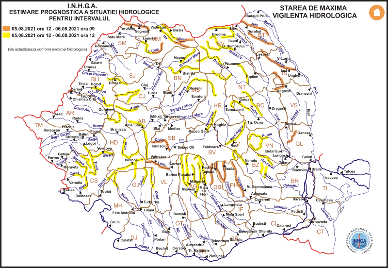 Institutul Naţional de Hidrologie şi Gospodărire a Apelor (INHGA) a emis, joi, o avertizare Cod portocaliu de viituri, valabilă până vineri dimineaţa pe râuri din Transilvania, Muntenia, Maramureş şi Moldova.