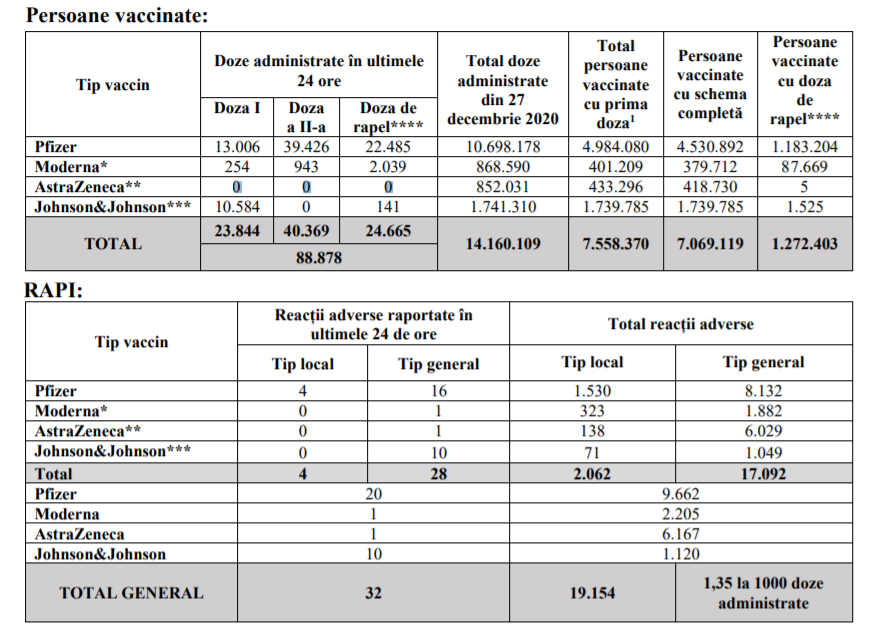 Astfel, în ultima zi, 88.878 de persoane s-au vaccinat anti-Covid, dintre care 23.844 cu prima doză sau cu vaccinul administrat într-o singură doză de la Johnson&Johnson, 40.369 de persoane cu a doua doză și 24.665 de persoane cu doza de rapel, conform CANCAV.