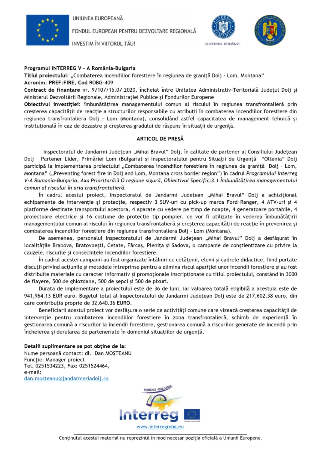 Inspectoratul de Jandarmi Județean „Mihai Bravul” Dolj, în calitate de partener al Consiliului Județean Dolj – Partener Lider, Primăriei Lom (Bulgaria) și Inspectoratului pentru Situaţii de Urgenţă “Oltenia” Dolj participă la implementarea proiectului „Combaterea incendiilor forestiere în regiunea de graniţă Dolj – Lom, Montana” („Preventing forest fire in Dolj and Lom, Montana cross border region”) în cadrul Programului Interreg V-A Romania-Bulgaria, Axa Prioritară:3 O regiune sigură, Obiectivul Specific:3.1 Îmbunătățirea managementului comun al riscului în aria transfrontalieră.