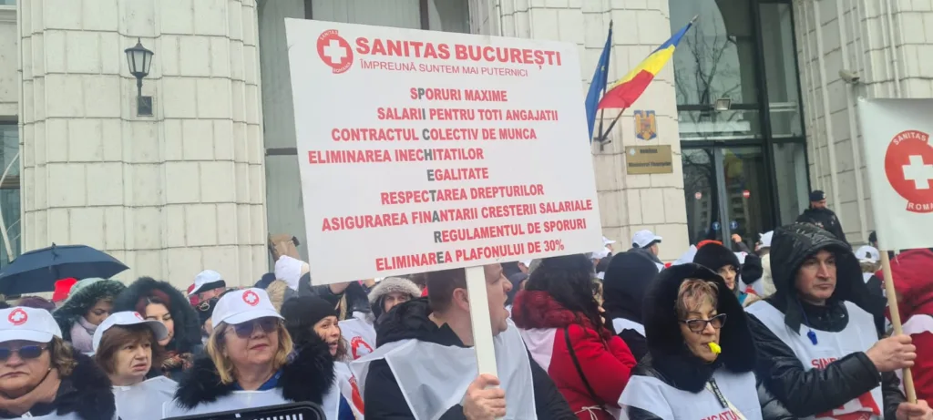 ”Suntem prezenţi la ministerul responsabil cu gestionarea banului public pentru a cere o majorare cu cel putin 20% a salariilor tuturor categoriilor profesionale care lucrează în Sănătate şi Asistenţă Socială! Guvernanţii trebuie să înţeleagă că răbdarea noastră, a angajaţilor din cele două domenii a ajuns la limită. Nu mai acceptăm amânări, explicaţii false sau promisiuni fără acoperire”, au transmis sindicaliştii.