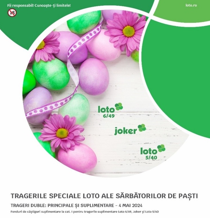 Loteria Română organizează sâmbătă, 4 mai 2024 și nu duminică, Tragerile Speciale Loto ale Sărbătorilor de Paști, informează compania. Asta înseamnă că pentru fiecare din jocurile Loto 6/49, Joker și Loto 5/40 vor avea loc două trageri: o tragere principală și o tragere suplimentară.