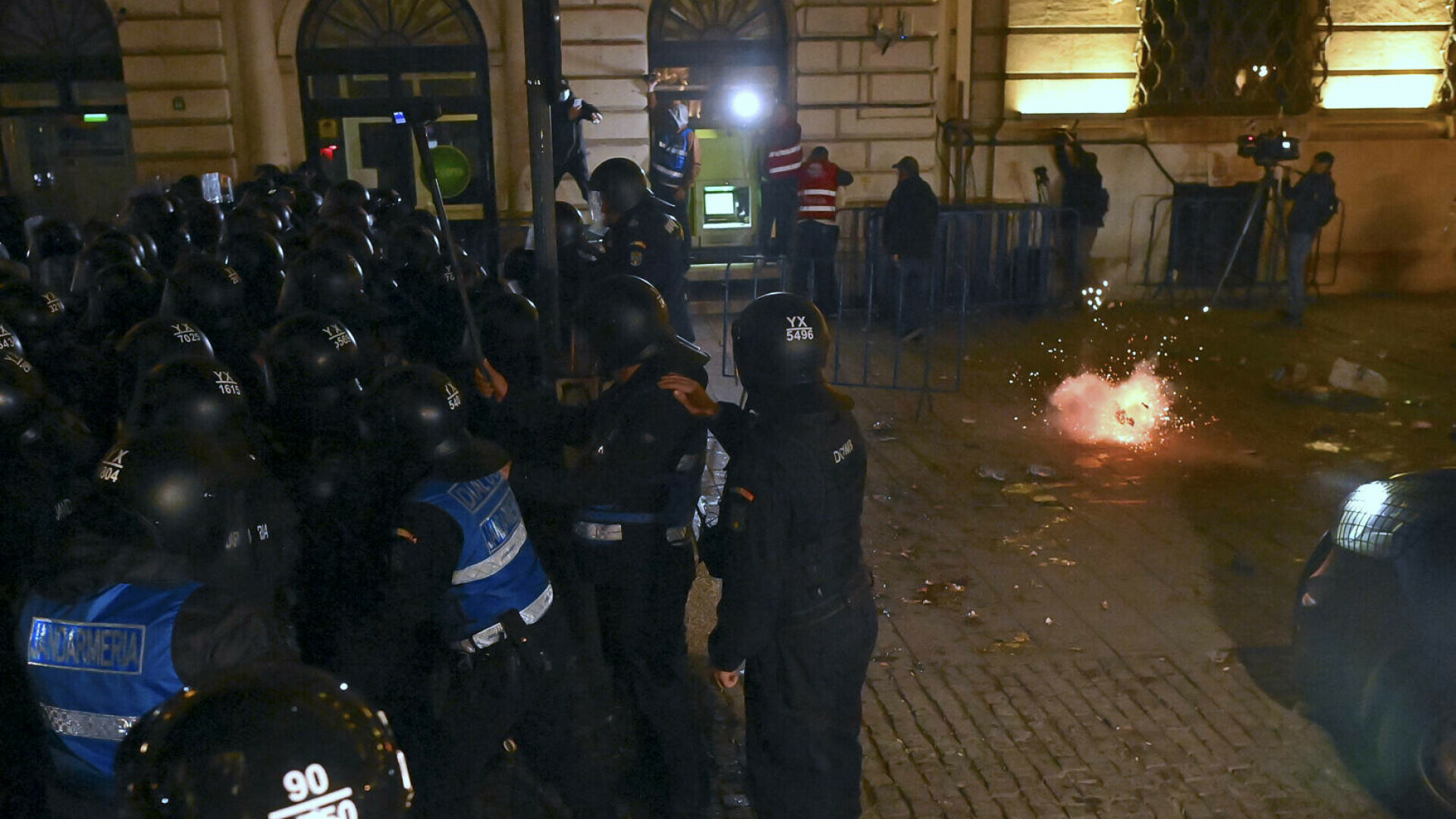 În acest context, „unii dintre participanții la protest au recurs la acte de violență fizică față de forțele de ordine, aruncând obiecte dure în direcția acestora și au provocat distrugeri stradale şi în dauna mai multor societăţi situate în acea zonă.” Protestatarii violenți, între care s-ar fi aflat și suporteri ai galeriilor de fotbal, au smuls bucăți de caldarâm și au aruncat cu ele în jandarmi, dar și cu alte obiecte din plastic și cu ouă.