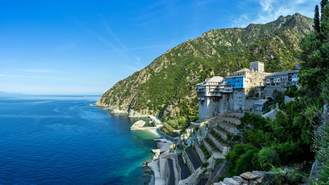 Comunitatea Muntelui Athos, situată în regiunea Macedonia din nordul Greciei, cuprinde 20 de mănăstiri locuite care datează de mai multe secole. Aceasta s-a bucurat de un anumit grad de autonomie încă din epoca bizantină.