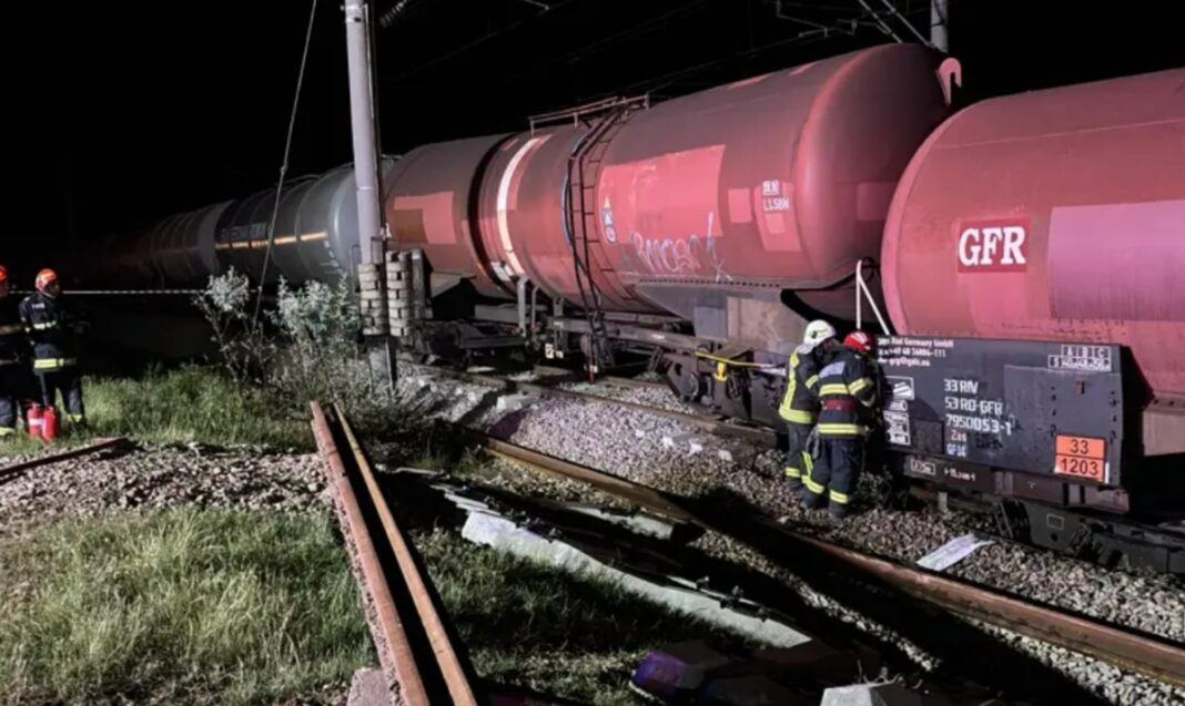 Locomotiva unui tren şi două vagoane cisternă încărcate cu benzină au deraiat, în noaptea de vineri spre sâmbătă, pe magistrala 100 Bucureşti – Craiova, în zona localităţii Măldăeni. Unul dintre vagoane prezintă scurgeri de combustibil, anunță ISU Teleorman.