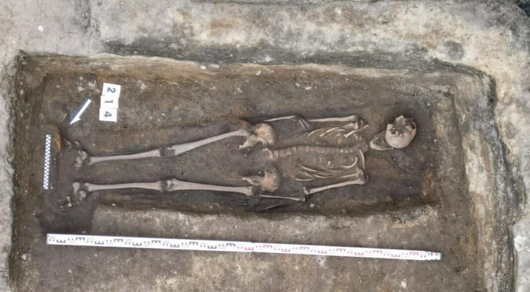 La începutul lunii iulie, piatra funerară a fost ridicată, dezvăluind scheletul complet al unui bărbat adult, despre care se estimează că a trăit în secolele al XIII-lea sau al XIV-lea.