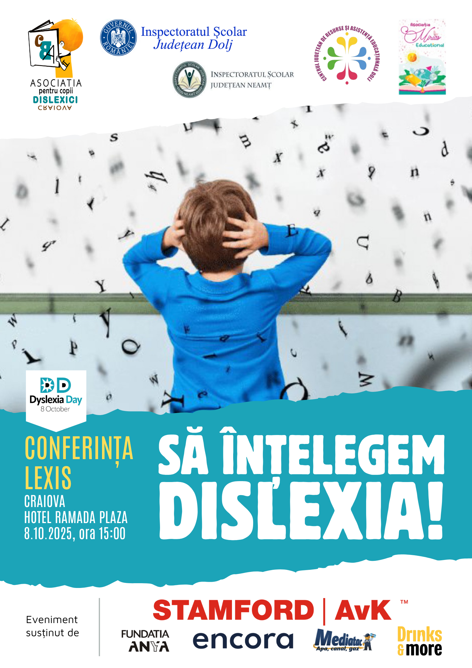 Asociația pentru Copii Dislexici Craiova, în parteneriat cu Asociația MIRIAS Educational, organizează ediția a II-a a proiectului DISLEXIA – EDUCAȚIE FĂRĂ BARIERE, eveniment ce include Conferința LEXIS, dedicată înțelegerii și sprijinirii copiilor cu Tulburări Specifice de Învățare (TSI), în special dislexia.