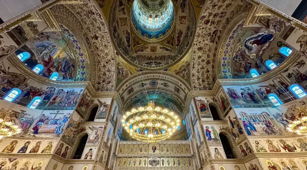 Vitralii uriașe, mozaic de Murano și icoane cu foiță din aur