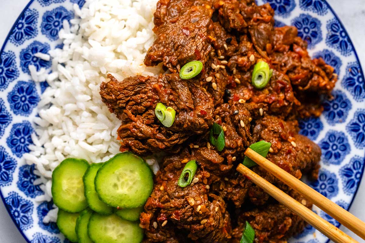 Ingrediente: 500 g carne de vită, felii subțiri; 1 pară sau măr, rasă fin; 1/2 ceapă, tăiată felii subțiri; 2 tulpini de ceapă de primăvară, feliate în diagonală; 2 căței de usturoi, tocați mărunt; 1 bucată de ghimbir, tocat mărunt; 2 linguri sos de soia; 1 lingură zahăr granulat; 1 lingură ulei de susan; 1 linguriță piper negru; 1 linguriță de susan prăjit; ulei de gătit; opțional, ciuperci și morcov