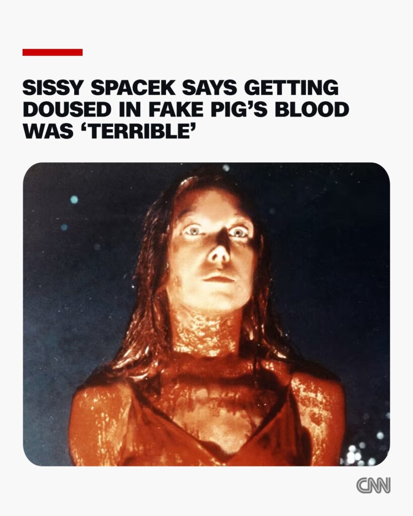Într-un interviu recent pentru „Entertainment Tonight”, înainte de împlinirea a 50 de ani de la lansarea filmului clasic din 1976, bazat pe romanul lui Stephen King, Spacek a povestit despre cum a fost să filmeze scena șocantă. „Cât de lipicios este sângele din filme”, a spus ea râzând. „A fost groaznic, groaznic, groaznic.”