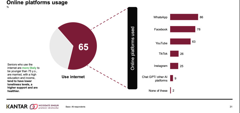 Pentru a păstra totuși legăturile cu ceilalți, majoritatea vârstnicilor au început să folosească tehnologia. Patru din șase respondenți utilizează internetul, în special WhatsApp (86%), Facebook (78%) și YouTube (63%). Datele arata că cei care folosesc aceste platforme se declară mai sănătoși și mai puțin singuri.