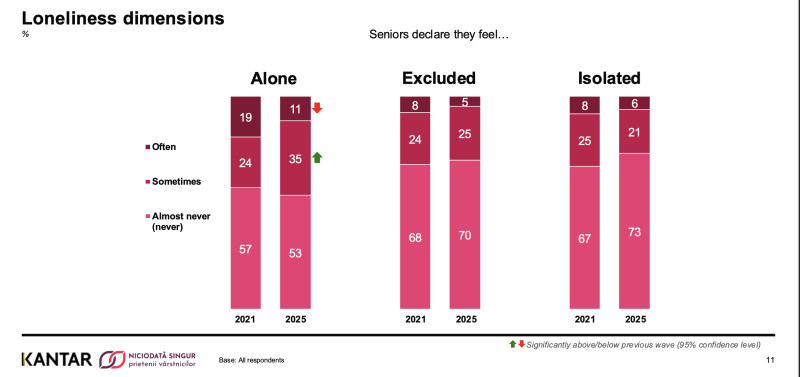 Studiul, realizat de Asociația „Niciodată Singur – Prietenii Vârstnicilor“, arată că 3 din 5 seniori declară că se simt singuri, iar 1 din 7 resimte un grad ridicat de singurătate: 46% dintre respondenți spun că se simt singuri „adesea” și „uneori”, 30% că se simt excluși, iar 27% izolați.