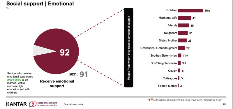 Potrivit studiului citat, 286.000 de vârstnici din orașe își petrec petrec sărbătorile singuri. În ceea ce privește sprijinul pe care aceștia se pot baza, familia rămâne esențială: copiii sunt principala sursă de sprijin emoțional pentru seniori, însă 29% dintre ei nu îi au aproape, locuind fie în alt oraș, fie în altă țară, iar 8% nu au copii deloc.