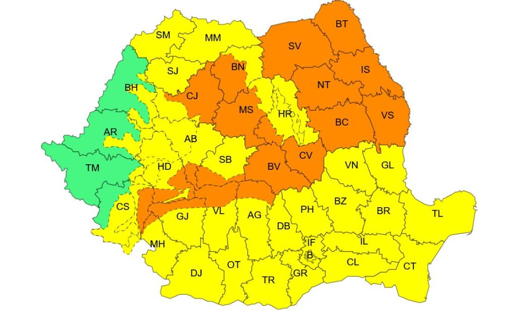 ANM a actualizat prognoza meteo pentru acest sfârșit de săptămână, anunțând noi avertizări pentru aproape întreaga țară. Codul portocaliu de viscol, care inițial viza zona înaltă a Carpaților Meridionali și de Curbură, a fost extins la 12 județe.