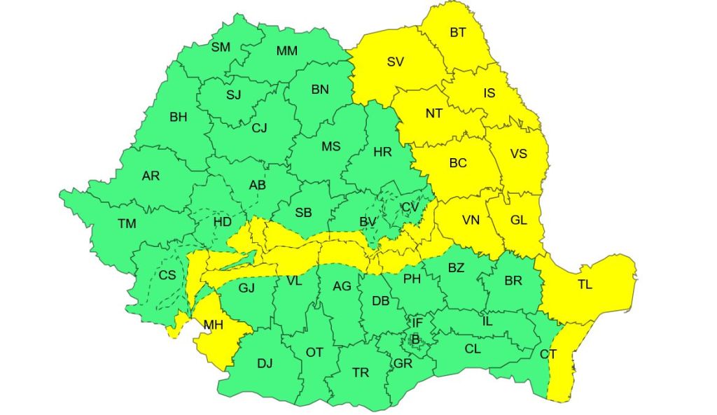 O avertizare meteo cod galben a intrat în vigoare sâmbătă dimineață, de la ora 10.30, ce va fi valabil până diseară, la ora 23. În Carpații Meridionali și de Curbură, rafalele vor atinge 60-85 km/h, iar la altitudini mari, chiar 90-110 km/h. Vântul va avea intensificări și în Moldova, vestul Olteniei, și în nordul și estul Dobrogei, cu viteze de 50-70 km/h, în zonele marcate cu galben pe hartă.