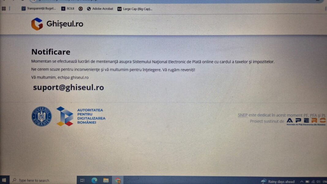 „Momentan, se efectuează lucrări de mentenanţă asupra Sistemului Naţional Electronic de Plată online cu cardul a taxelor şi impozitelor. Ne cerem scuze pentru inconvenienţe şi vă multumim pentru înţelegere. Vă rugăm reveniți!”. Este mesajul pe care îl văd cei care intră pe platforma Ghiseul.ro. Probleme au fost și luni, inclusiv pe aplicația dedicată dispozitivelor mobile