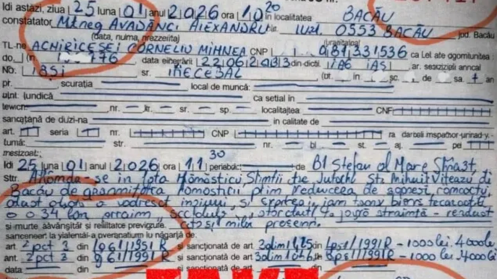 Potrivit documentului falsificat și distribuit online, un cetățean care ar fi participat la manifestările de 24 ianuarie în Iași ar fi fost amendat de Jandarmeria Bacău cu suma de 2.000 de lei, însă procesul-verbal conține o serie de erori care denotă faptul că a fost generat automat cu AI.