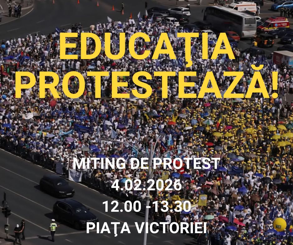 Sindicaliștii din Educație ies din nou în stradă. Membrii Federației Sindicatelor Libere din Învățământ, Federației Sindicatelor din Educație „Spiru Haret” și Federației Naționale Sindicale „Alma Mater” protestează miercuri, 4 februarie, în fața Guvernului.