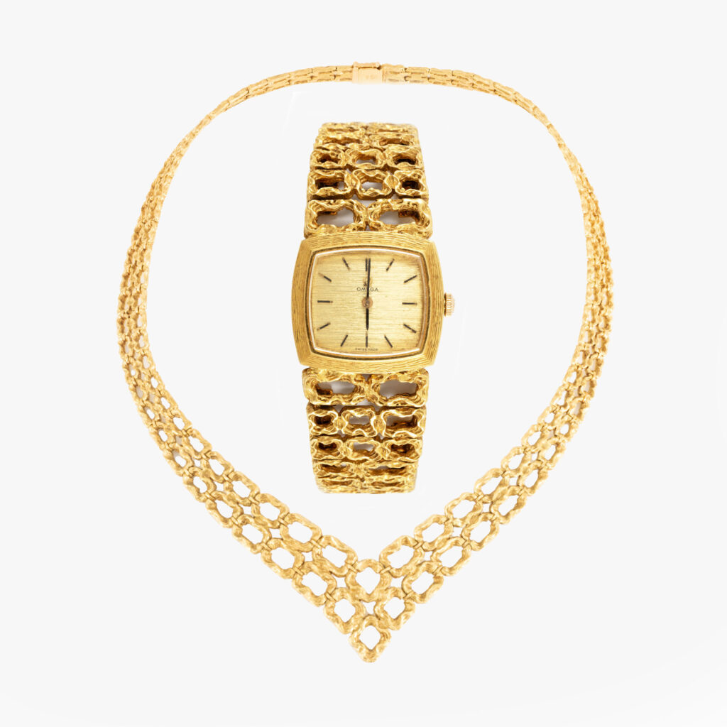 - Set de colecție Omega & colier Gilbert Albert, aur, preț de pornire 19.000 € (față de 30.000 €).