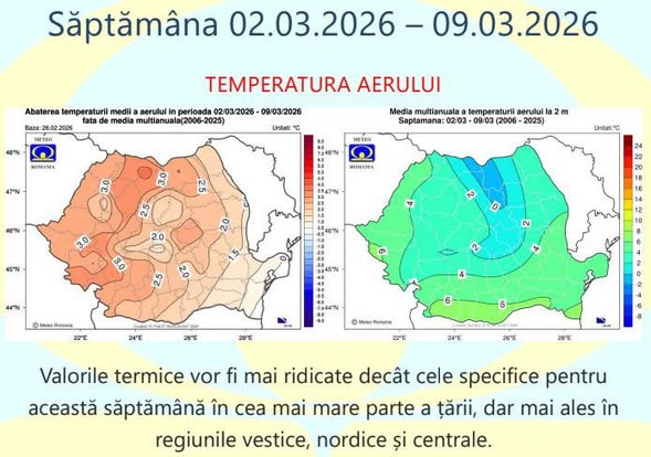 Conform prognozei pe medie durată a modelului global al centrului european (ECMWF), până spre finalul primei decade a lunii martie (9 martie) vom avea parte de o vreme stabilă ca aspect, având în vedere că presiunea atmosferică, cu mici variaţii de la un interval la altul, se va menţine ridicată în cea mai mare parte a continentului, implicit peste spaţiul geografic al ţării noastre. Din acest motiv, vor predomina zilele însorite, iar precipitaţiile vor fi foarte puţine, trecător ploi în zonele joase şi mixte la munte, astfel încât regimul pluviometric va fi deficitar. Sub aspect termic vom înregistra temperaturi mai ridicate comparativ cu mediile multianuale (acestea fiind cuprinse între 3…5 grade în depresiuni şi 9…10 în sud-sud-vest, la valorile diurne şi între -6…-4 grade în estul Transilvaniei şi 1…2 grade în sud-sud-est, la valorile nocturne), astfel estimările indică temperaturi maxime cuprinse în marea lor majoritate între 10 şi 17 grade şi temperaturi minime în general între -6 şi 4 grade, local mai scăzute totuşi la munte, cu menţiunea că în perioada 6 – 8 martie este posibilă o răcire a vremii.