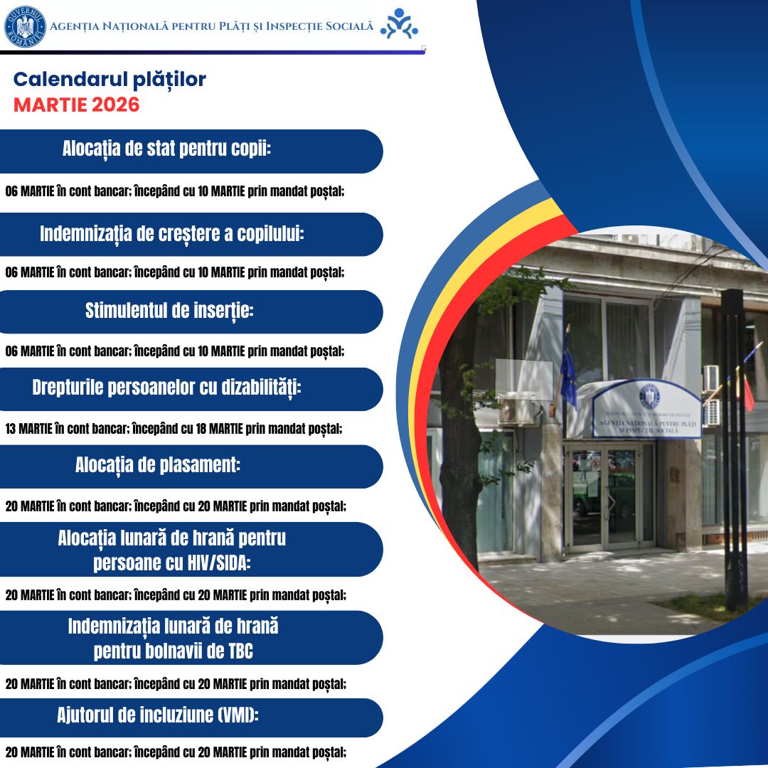 Vești importante pentru milioane de beneficiari din România. Agenția Națională pentru Plăți și Inspecție Socială (ANPIS) anunță plata în avans, în luna martie 2026, a beneficiilor de asistență socială aferente drepturilor din februarie.