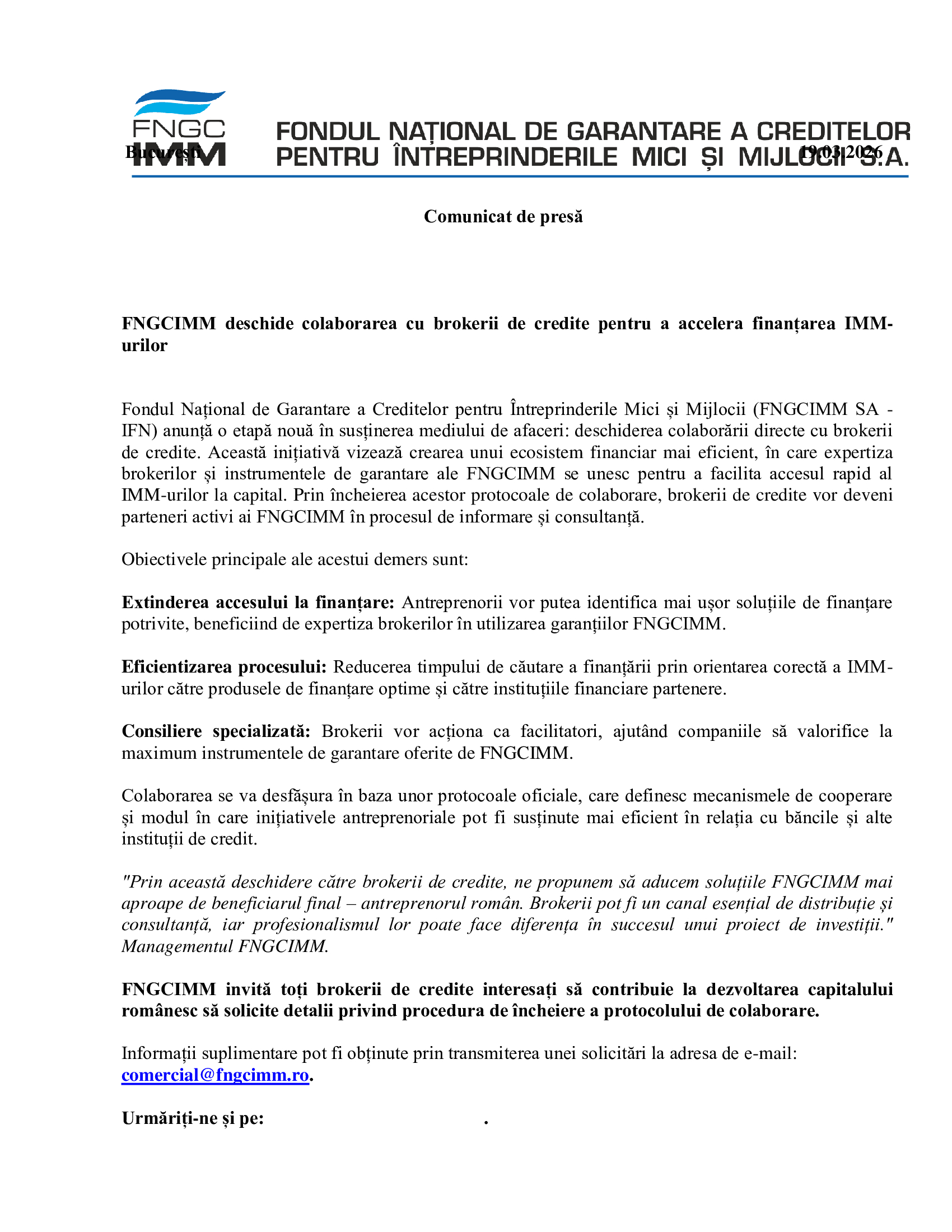 „Prin această deschidere către brokerii de credite, ne propunem să aducem soluțiile FNGCIMM mai aproape de beneficiarul final – antreprenorul român. Brokerii pot fi un canal esențial de distribuție și consultanță, iar profesionalismul lor poate face diferența în succesul unui proiect de investiții.” Managementul FNGCIMM.