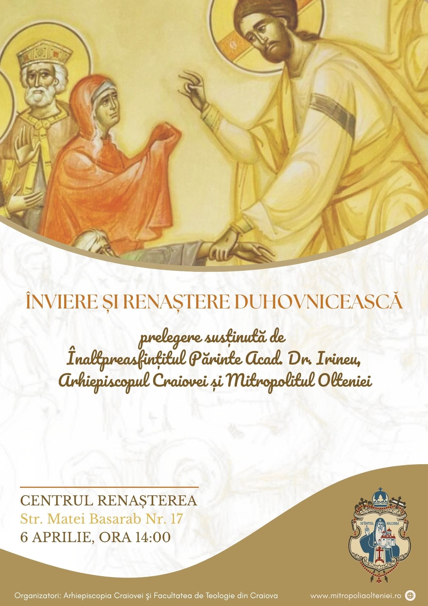 Părintele Mitropolit Irineu va conferenţia la Craiova: „Înviere și renaștere duhovnicească” – prelegere duhovnicească în Săptămâna Pătimirilor.