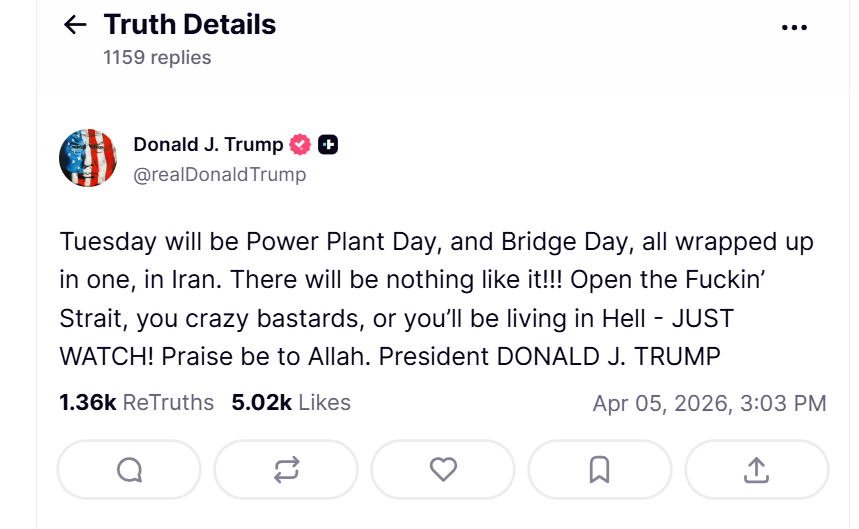 „Deschideţi nenorocita de Strâmtoare, ticăloşi nebuni, sau veţi trăi în Iad – DOAR UITAŢI-VĂ! Slavă lui Allah”, este noul ultimatum al preşedintelui Donald Trump, aşa cum a scris pe Truth Social.