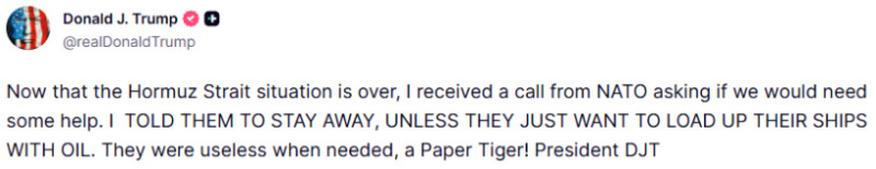 Într-o postare publicată pe platforma Truth Social, Donald Trump a afirmat că NATO ar fi contactat Washingtonul pentru a întreba dacă Statele Unite au nevoie de sprijin în contextul tensiunilor din Strâmtoarea Ormuz, conform digi24.ro.