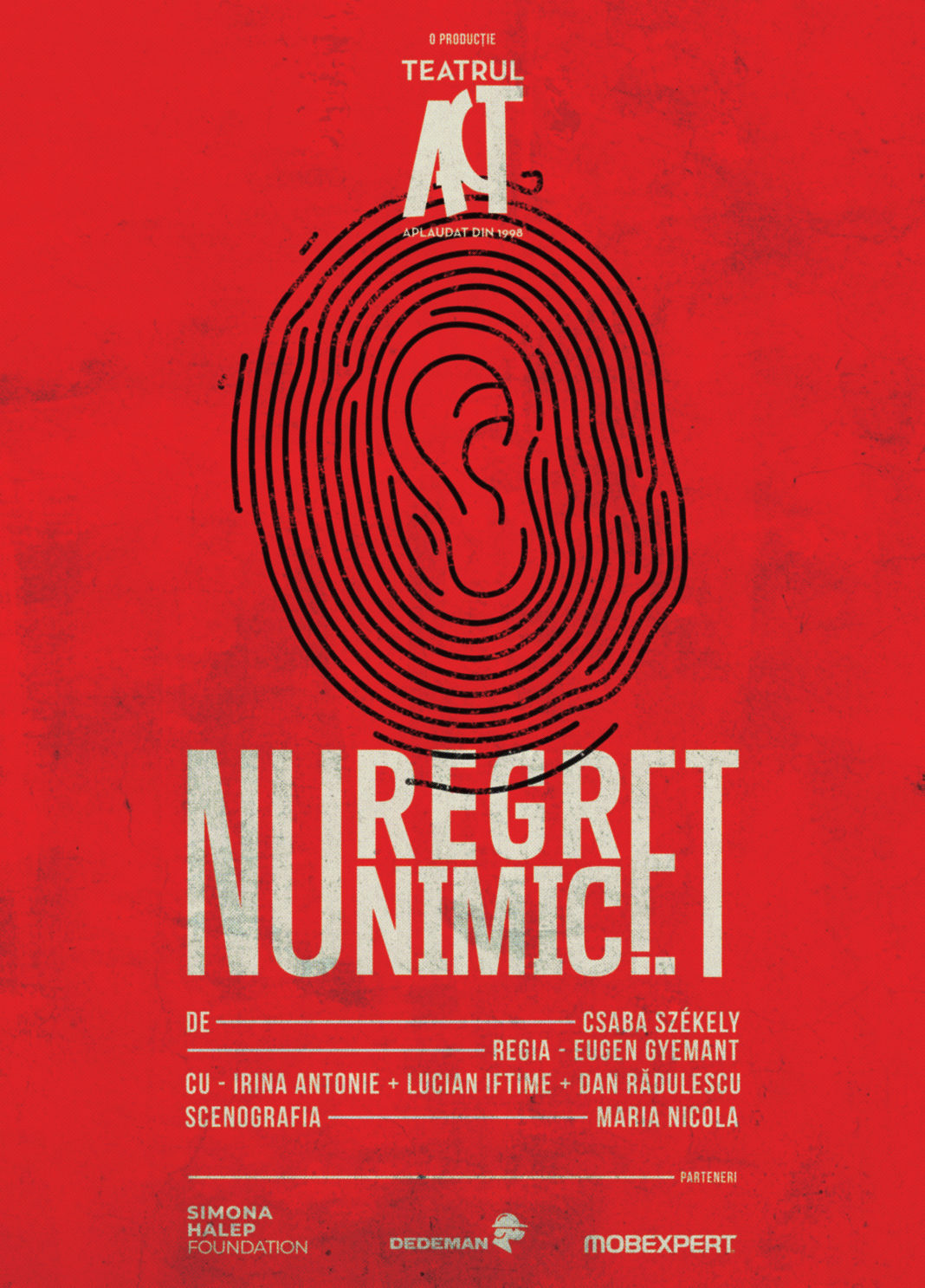 Spectacolul „Nu regret nimic“, de Székely Csaba, este programat joi, 28 noiembrie 2019, la ora 19.00. Spectacolul se adresează unui public de peste 16 ani şi este regizat de Eugen Gyemant, scenografia fiind semnată de Maria Nicola şi joacă actorii: Irina Antonie, Lucian Iftime, Dan Rădulescu.
