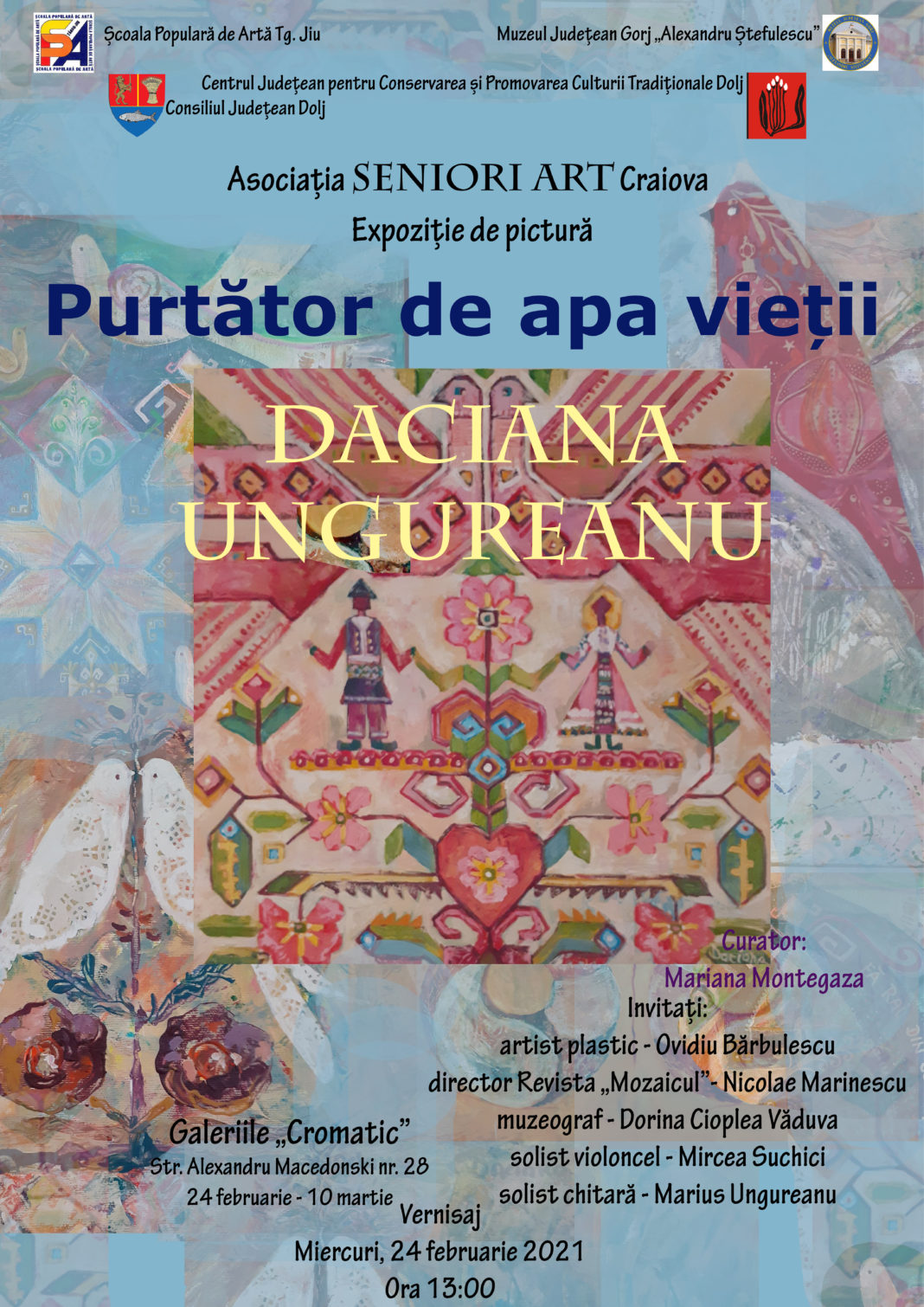 Centrul Judeţean pentru Conservarea şi Promovarea Culturii Tradiţionale Dolj deschide miercuri, 24 februarie, ora 13.00, la Galeriile „Cromatic“, expoziția de pictură „Purtător de apa vieții“, realizată de Daciana Ungureanu, sub egida Asociației Seniori Art Craiova, cu sprijinul Muzeului Județean Gorj „Alexandru Ștefulescu“ și al Școlii Populare de Artă Gorj.
