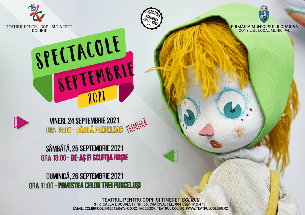 Duminică, 26 septembrie 2021, la ora 11.00, este programat spectacolul Povestea celor trei purceluși, teatru interactiv, vesel și educativ, de și cu Geo Dinescu și Marin Fagu, pictură Iulia Goanță, desen afiș Ioana și Andrei Popescu.