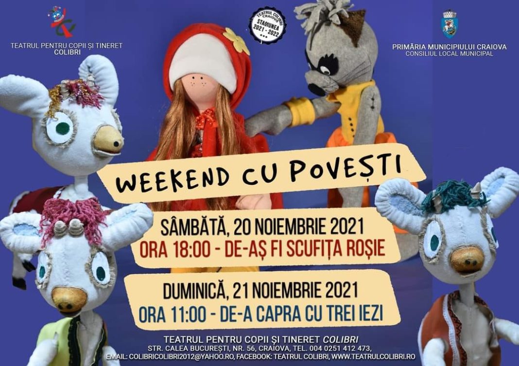 Teatrul pentru copii și tineret Colibri Craiova propune pentru acest sfârșit de săptămână spectacolele „De-aș fi Scufița Roșie“ și „De-a capra cu trei iezi“ și întâlnirea cu actorii Geo Dinescu, Marin Fagu, Ionica Dobrescu, Oana Stancu, Alis Ianoș, Iulia Cârstea, Daniel Mirea, Emanuel Popescu.