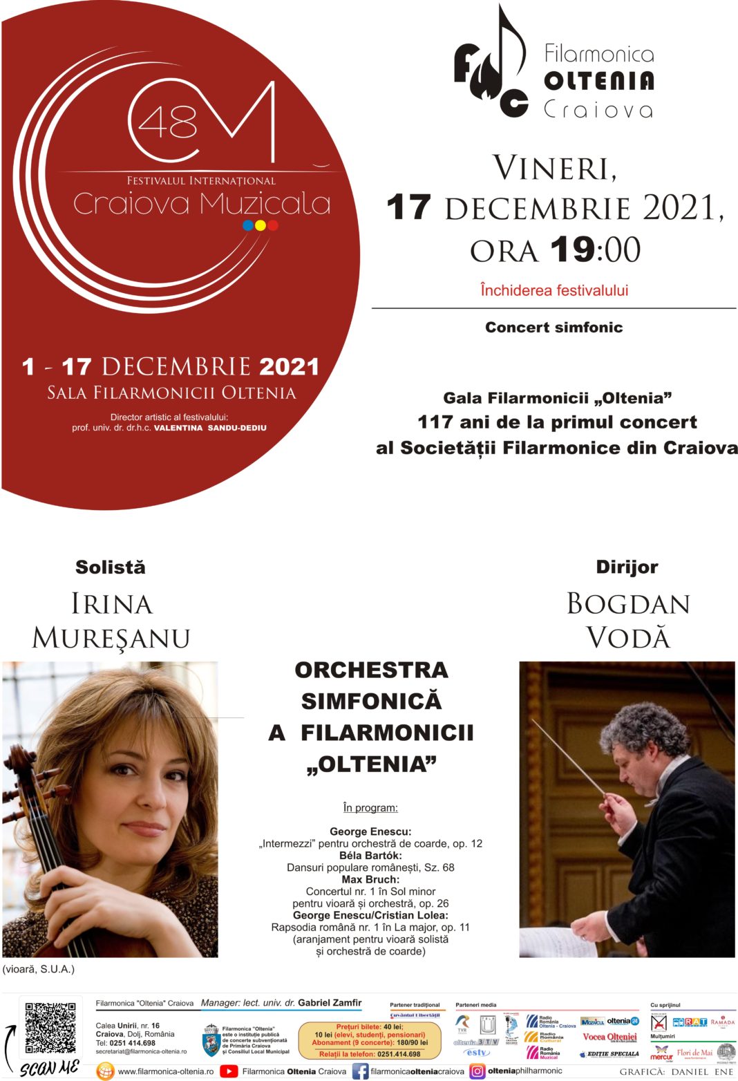 Festivalul Internaţional „Craiova Muzicală” 2021 (ediţia 48), organizat de Filarmonica „Oltenia” Craiova, continuă săptămâna aceasta cu concerte camerale şi un concert simfonic, în datele de 16 şi 17 decembrie, toate evenimentele începând la ora 19.00.