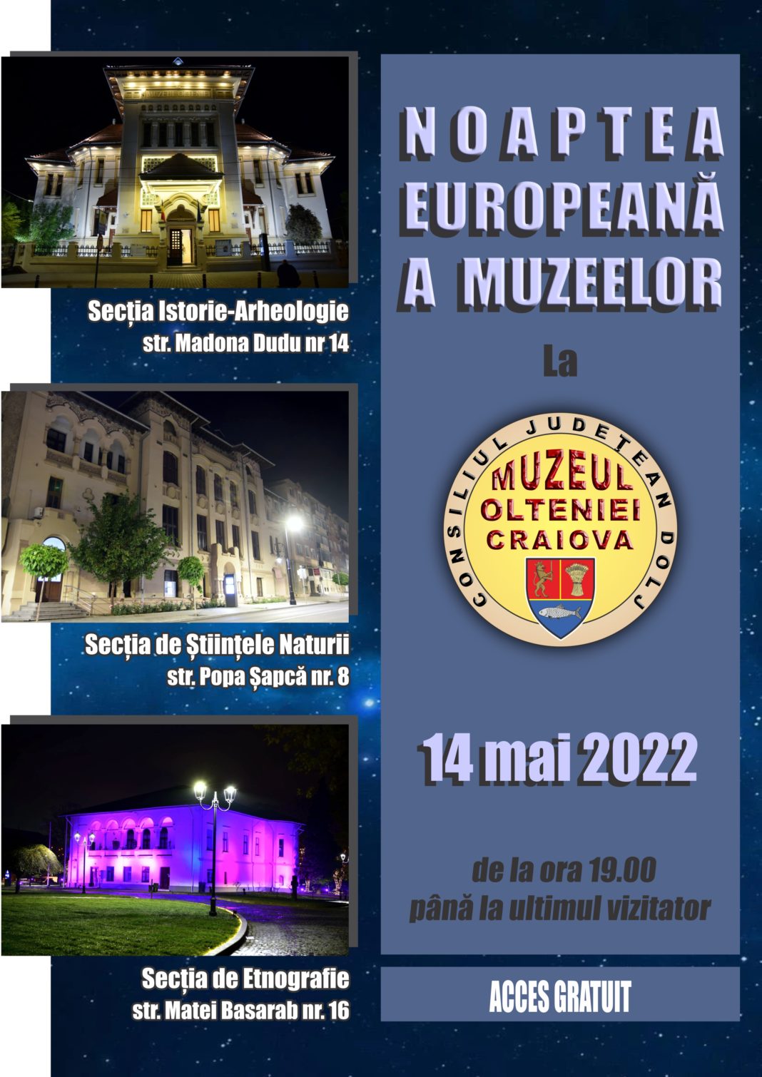 Evenimentul european Noaptea Muzeelor, ediția a-XVIII-a, se va desfășura la Craiova, la Muzeul Olteniei, sâmbătă, 14 mai 2022, începând cu ora 19.00, până la terminarea fluxului de vizitatori.