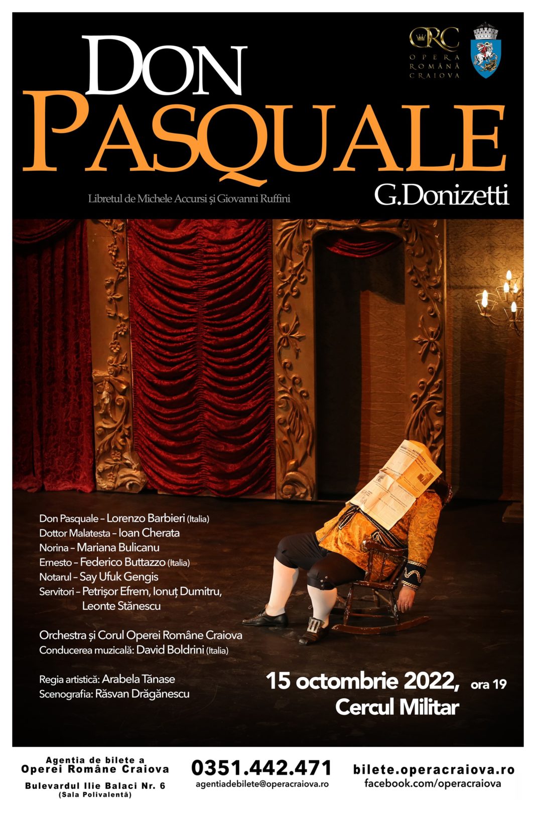 Opera Română Craiova deschide stagiunea 2022-2023 cu spectacolul „Don Pasquale”, sâmbătă, 15 octombrie 2022, începând cu ora 19.00, în sala Cercului Militar Craiova.